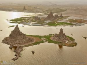 This area is actively volcanic, and produces formidable and colorful landscapes. As the plates drift apart, the crust above them thins and cracks, allowing magma to push to the surface through the thin spots and warm underwater springs. This is accompanied by series of earthquakes and formation of deep fissures in the terrain running for hundreds of metres and sinking of valley floor across the Depression. In September and October 2005 alone, a total of 163 earthquakes of magnitudes greater than 3.9 and a volcanic eruption occurred within the Afar rift at the Dabbahu and Erta Ale volcanoes. The region is home to more than thirty young volcanoes, sulphurous yellow hot springs and salt plains. As the boiling water bubble up to the surface, they deposit the dissolved calcium carbonates creating towering chimneys. Some of these chimneys reach heights of 50 meters, and puffs of steam vent from the top. Sulphur, other minerals and possibly thermopylae bacteria cause spectacular colors. The low elevation of the region allowed the Red Sea to periodically flood into the Depression, leaving behind salt ‘white gold’ from the evaporated seawater; the latest flood is estimated to have occurred roughly 30,000 years ago.